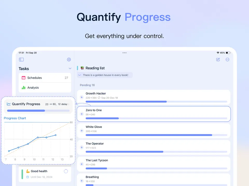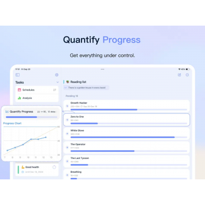 A simple and easy-to-use goal tracking app that displays colorful stripes towards accomplishing goals. It is possible to view progress in the form of graphs and diagrams. Upon completion of this or that task, the streak responsible for it will be filled with green color and marked with a white checkmark.