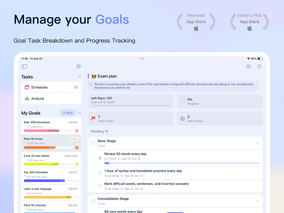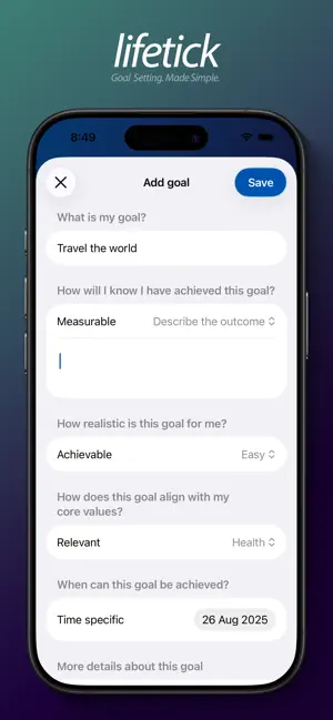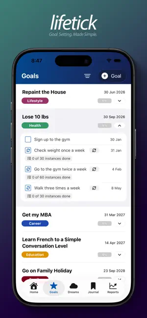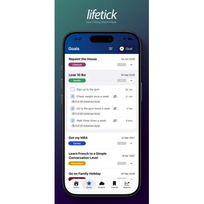 Lifetick: focuses on long-term, value-driven goals. It helps break down life goals into actionable steps with clear milestones and is excellent for personal development and achieving meaningful objectives.