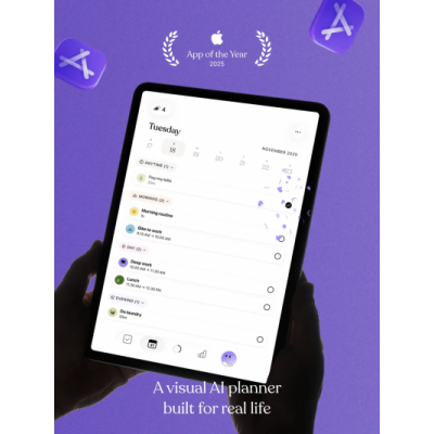 Tiimo is a unique visual organizer app designed specifically for people with ADHD: timers, picture-based schedules, gentle reminders, and caregiver sharing.