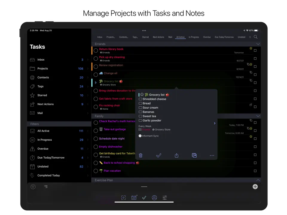 Any.do delivers a clean, user-friendly experience for personal daily tasks and calendar integration. Voice entry, “My Day” view, grocery lists, location-based reminders, and calendar sync make it great for everyday life. Subtasks, recurring tasks, priorities, and WhatsApp-style chat for family sharing add convenience. Multi-platform support (iOS, Android, Web, desktop) and offline mode work well. Freemium with Premium ~$5–8/month. The app feels approachable and modern, but customization is basic, and there’s no habit tracking or advanced project views.
