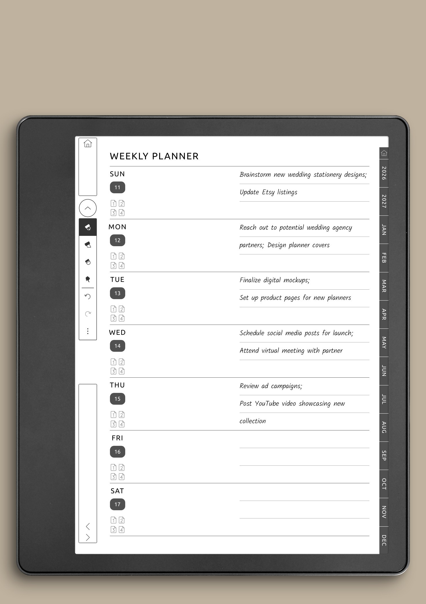 On Kindle Colorsoft devices, weekly planners are optimized to avoid overcrowding while still offering enough structure to stay organized. Layouts are designed to remain clear even when filled with handwritten notes, making them well-suited for professional planning, academic schedules, and personal organization. Used consistently, weekly planners help maintain rhythm and continuity without introducing unnecessary complexity.