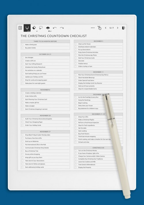 Countdown to the long-awaited holiday with this handy template. View the list of tasks and tick off what you have done. Choose the type of layout (for paper or digital planner), specify the parameters you are interested in and download the PDF file.