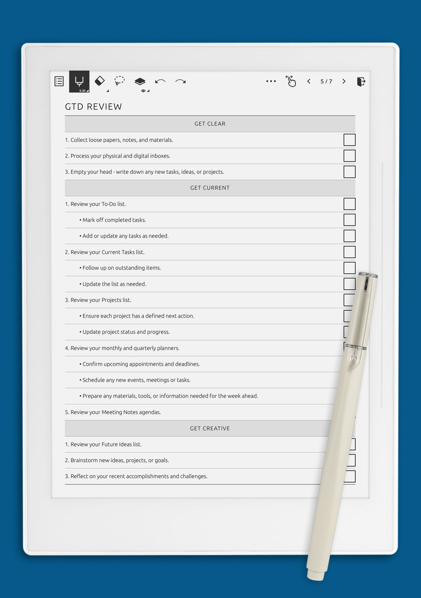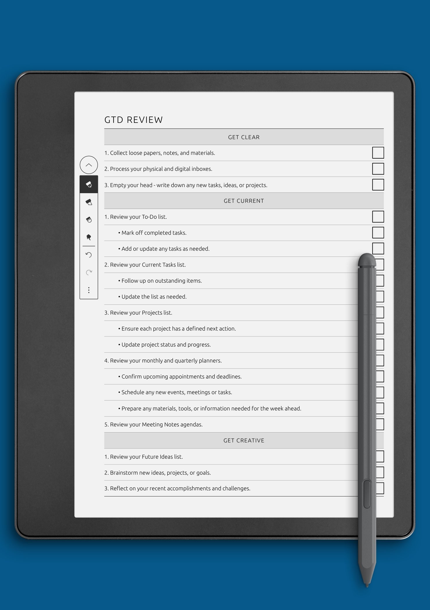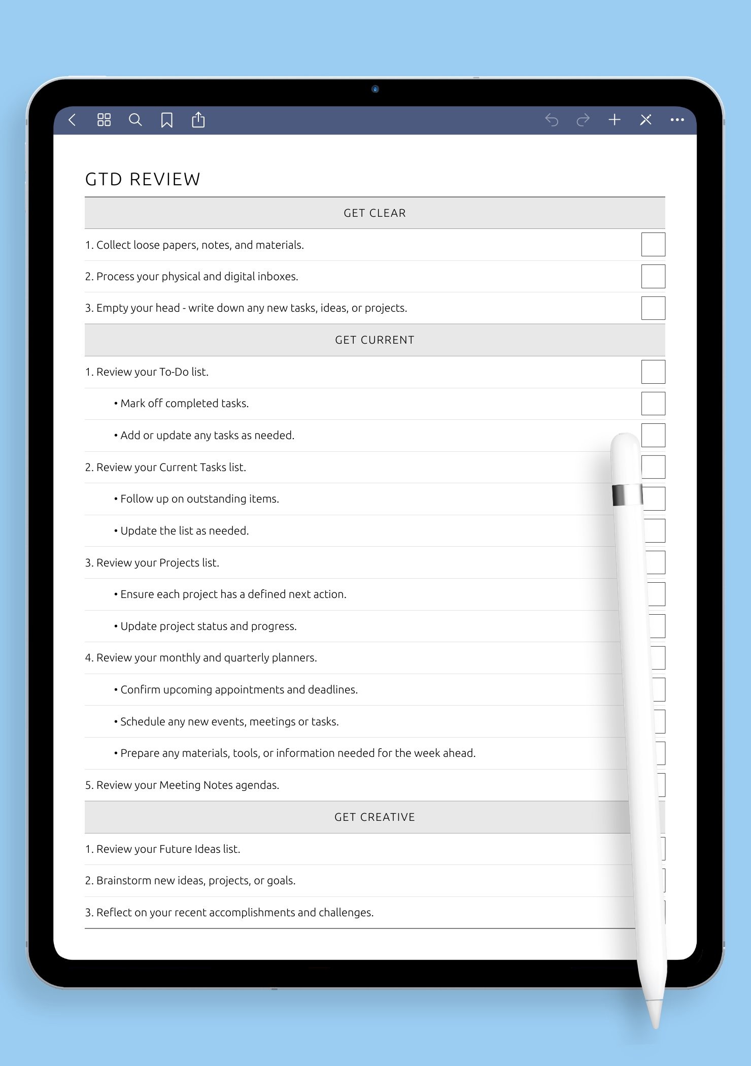 The GTD Review Template is a structured checklist designed to help you stay organized and productive using the Getting Things Done (GTD) method. This template guides you through three key steps: Get Clear (decluttering tasks and ideas), Get Current (reviewing to-do lists, projects, and schedules), and Get Creative (brainstorming new ideas and reflecting on progress). It ensures you stay on top of your tasks, streamline your workflow, and maintain clarity in your personal and professional life.