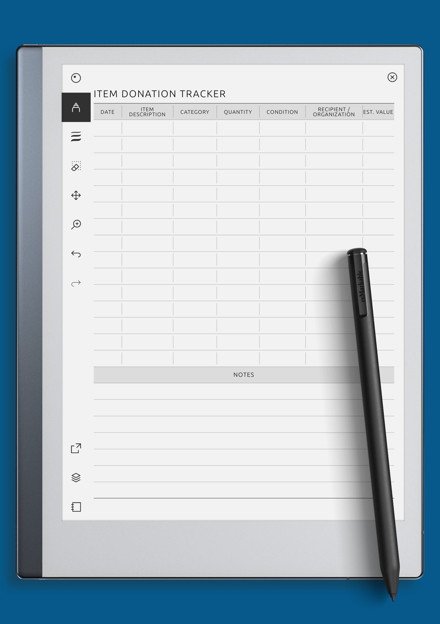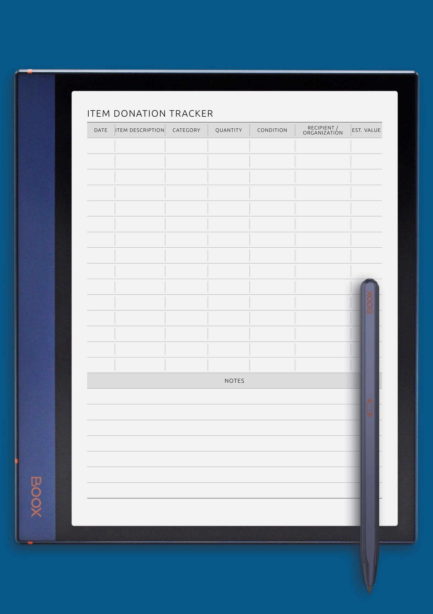 The Item Donation Tracker helps you organize and record your contributions. Log dates, item descriptions, categories, recipients, and estimated values to keep track of your charitable giving and decluttering efforts.