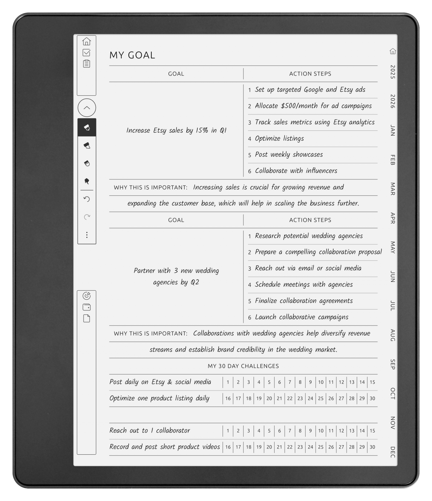 Download the PDF file to your Kindle Scribe tablet and enjoy its hyperlinked structure, which makes it handy and easy to use. Personal planner settings are available, including a choice of right-handed or left-handed mode and a week start day option.
