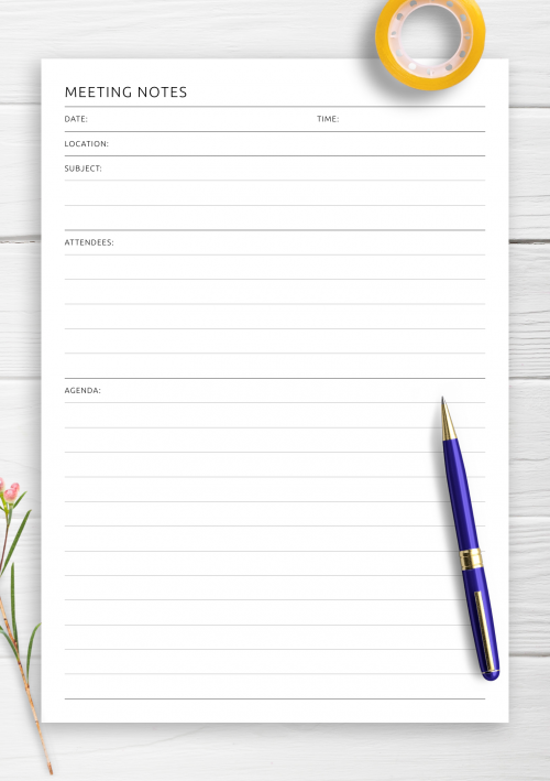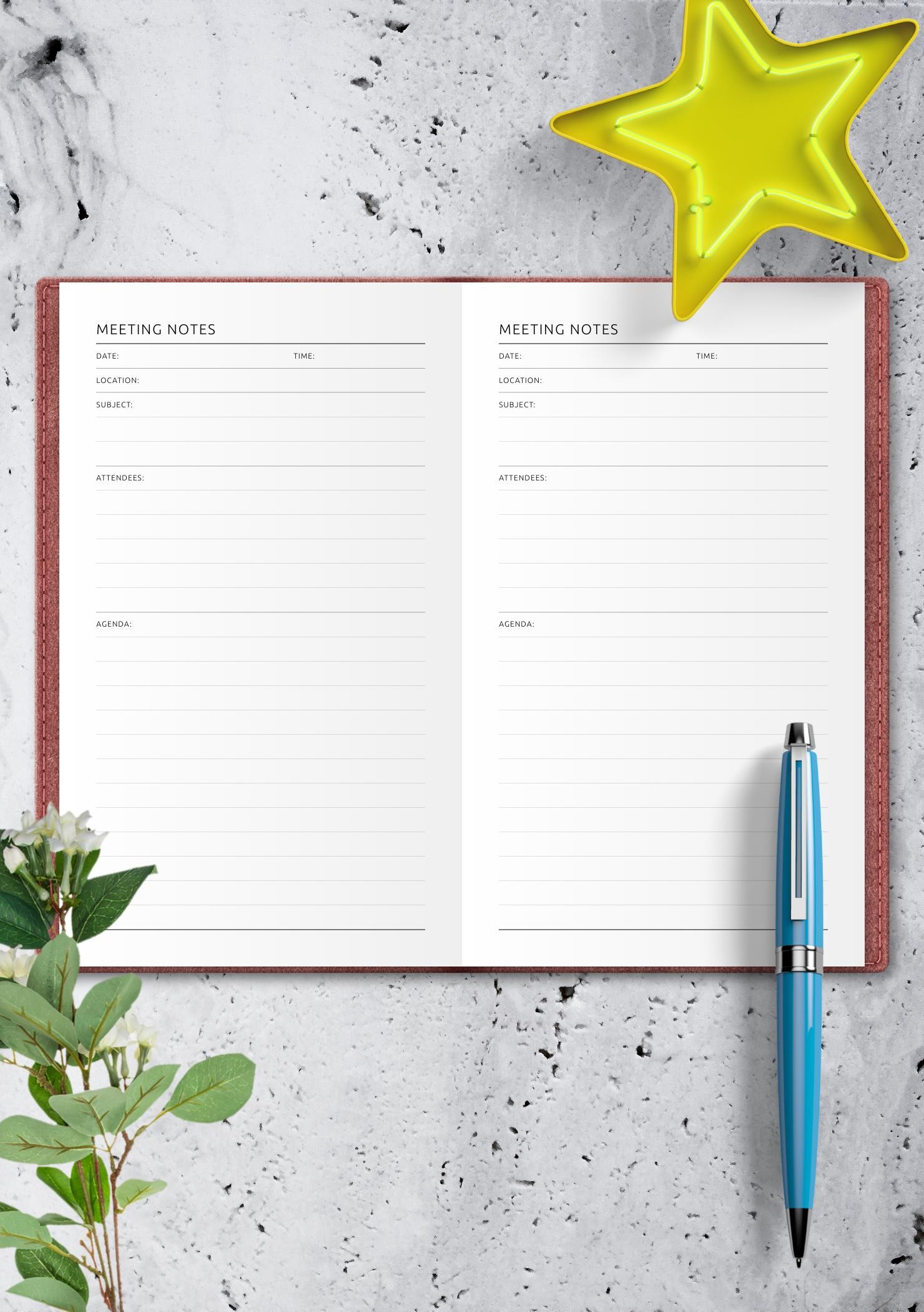 This Meeting Notes template gives you a clear structure for capturing the most important details during discussions. At the top, you’ll find fields for basic information — date, time, location, subject, and attendees — so you can document the essentials quickly and keep records organized.