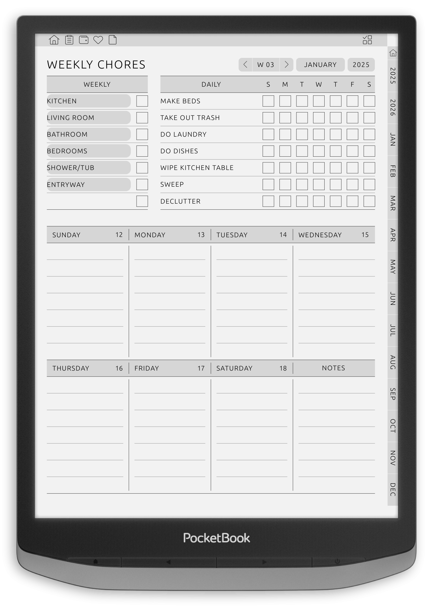 Stay on top of every task at home with the Pocket Book Household & Cleaning Planner โ a clean, powerful system for managing your daily routines, deep cleaning, and essential household info. Designed specifically for your Onyx Boox, this planner gives you everything you need to bring order to your space with clarity and confidence.