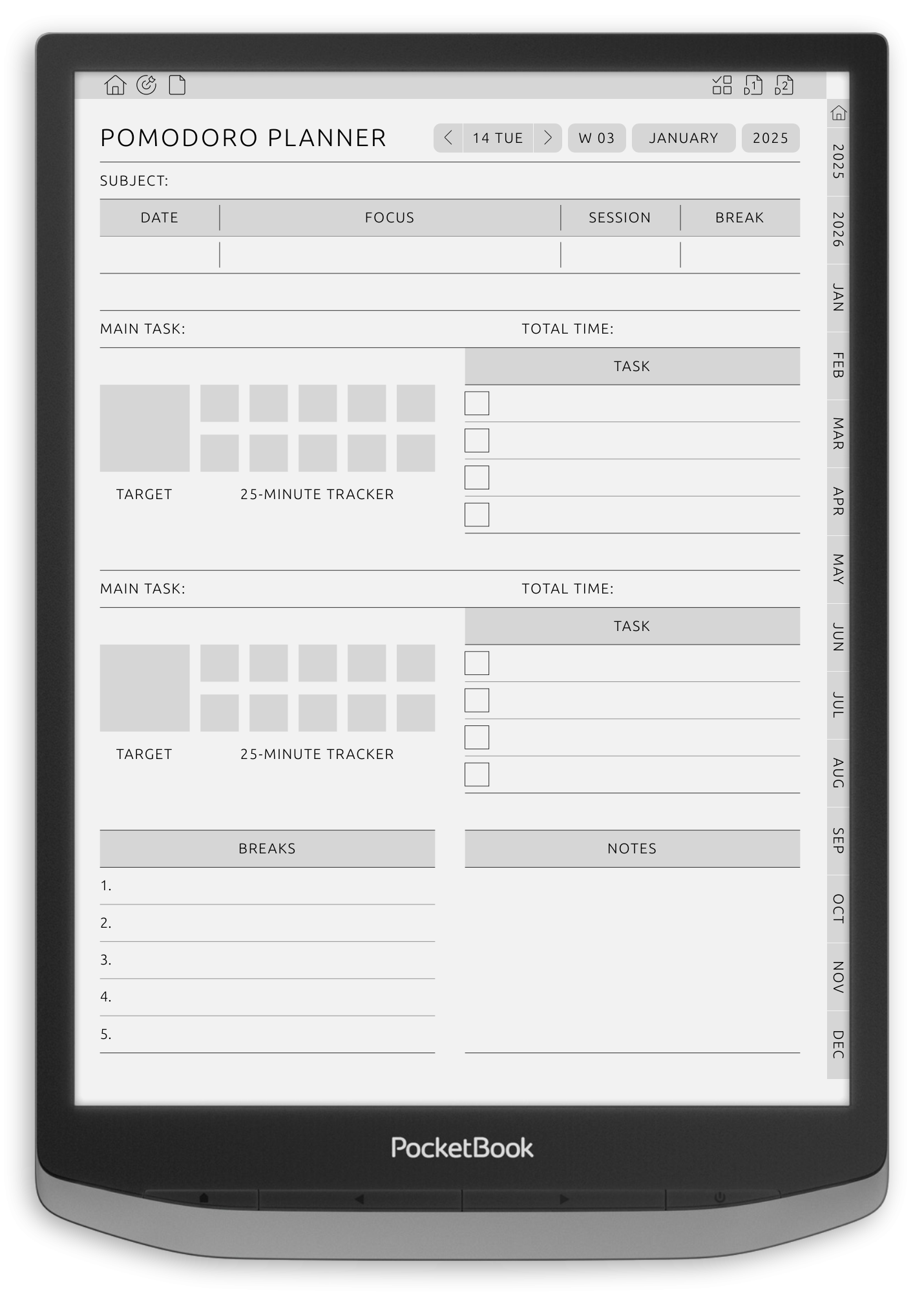 This hyperlinked digital planner includes specialized layouts for work sessions, short and long breaks, daily focus goals, and end-of-day task reviews - all optimized for distraction-free planning on Pocket Book Note and similar devices.