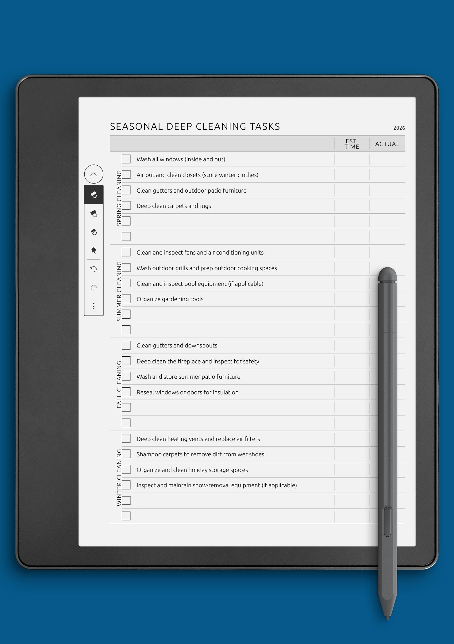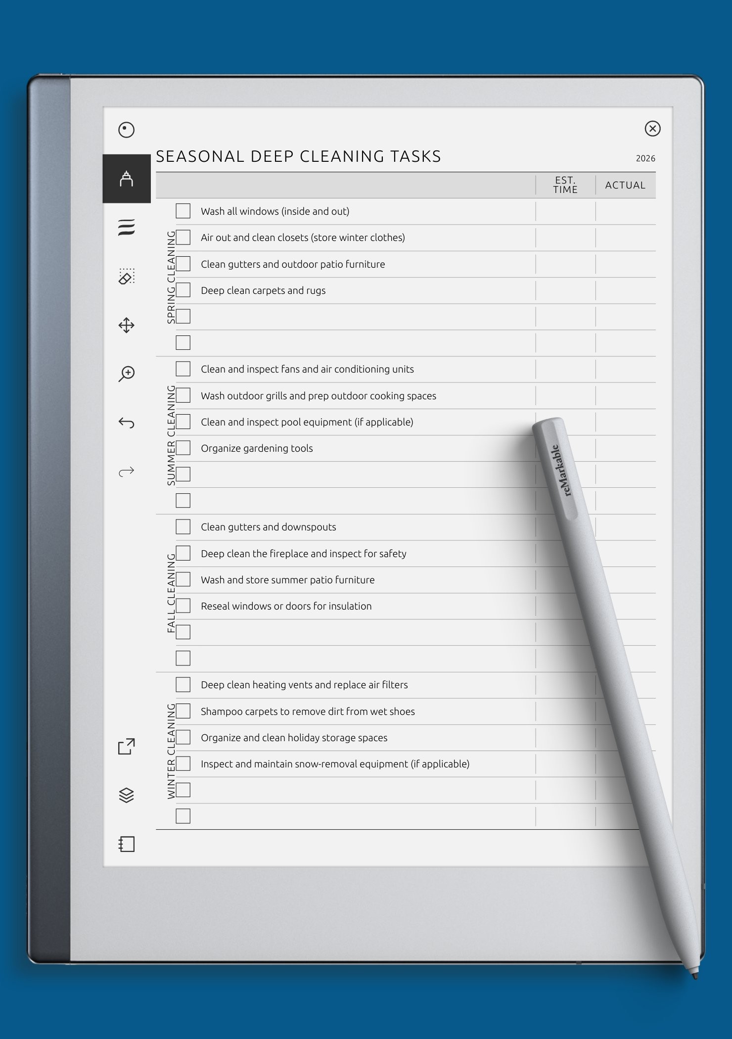 The Seasonal Deep Cleaning Tasks layout helps you stay organized year-round by breaking down essential cleaning tasks for each season. With space to track completion dates and notes, this template ensures your home is always refreshed and well-maintained, no matter the time of year.