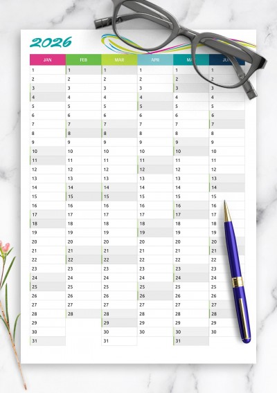 Two pages yearly calendar with vertical month sections. There is half a year on one page. Each day box has enough space to write something important such as b-day person's name or upcoming event.