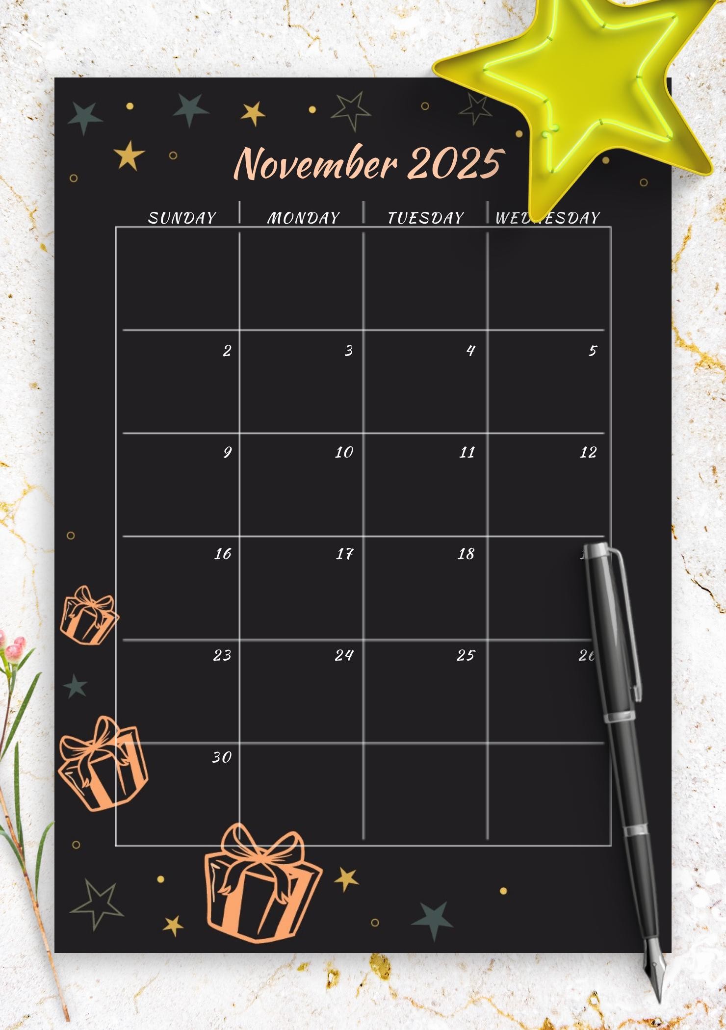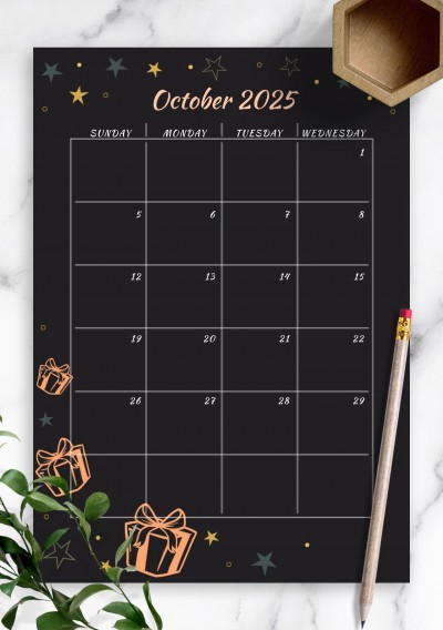 Birthday calendar template with a dark background and cool decorations. The template comes with a two-page format and features a classic monthly grid for easy planning. Download and print.