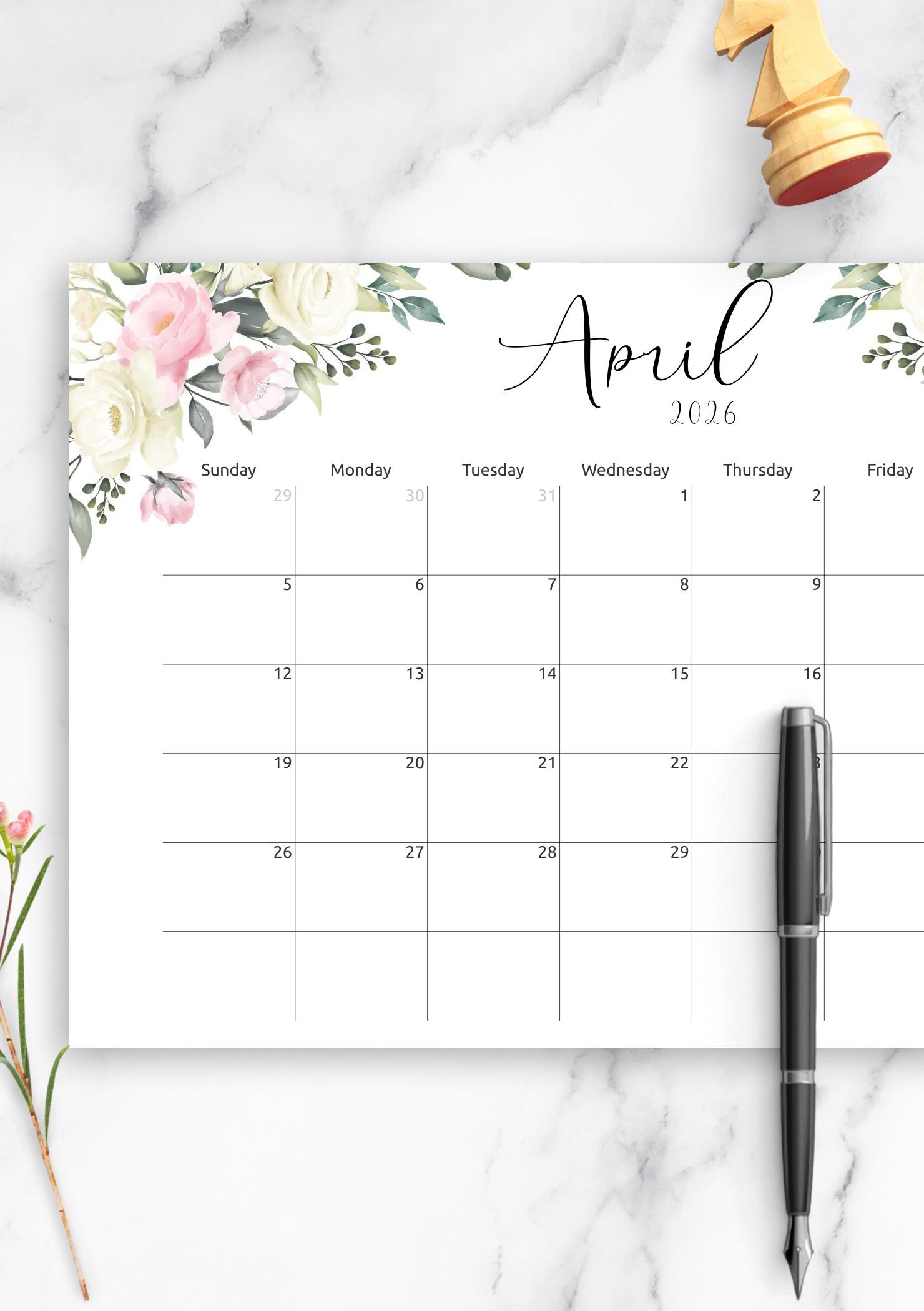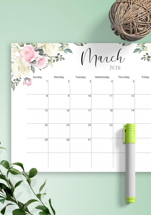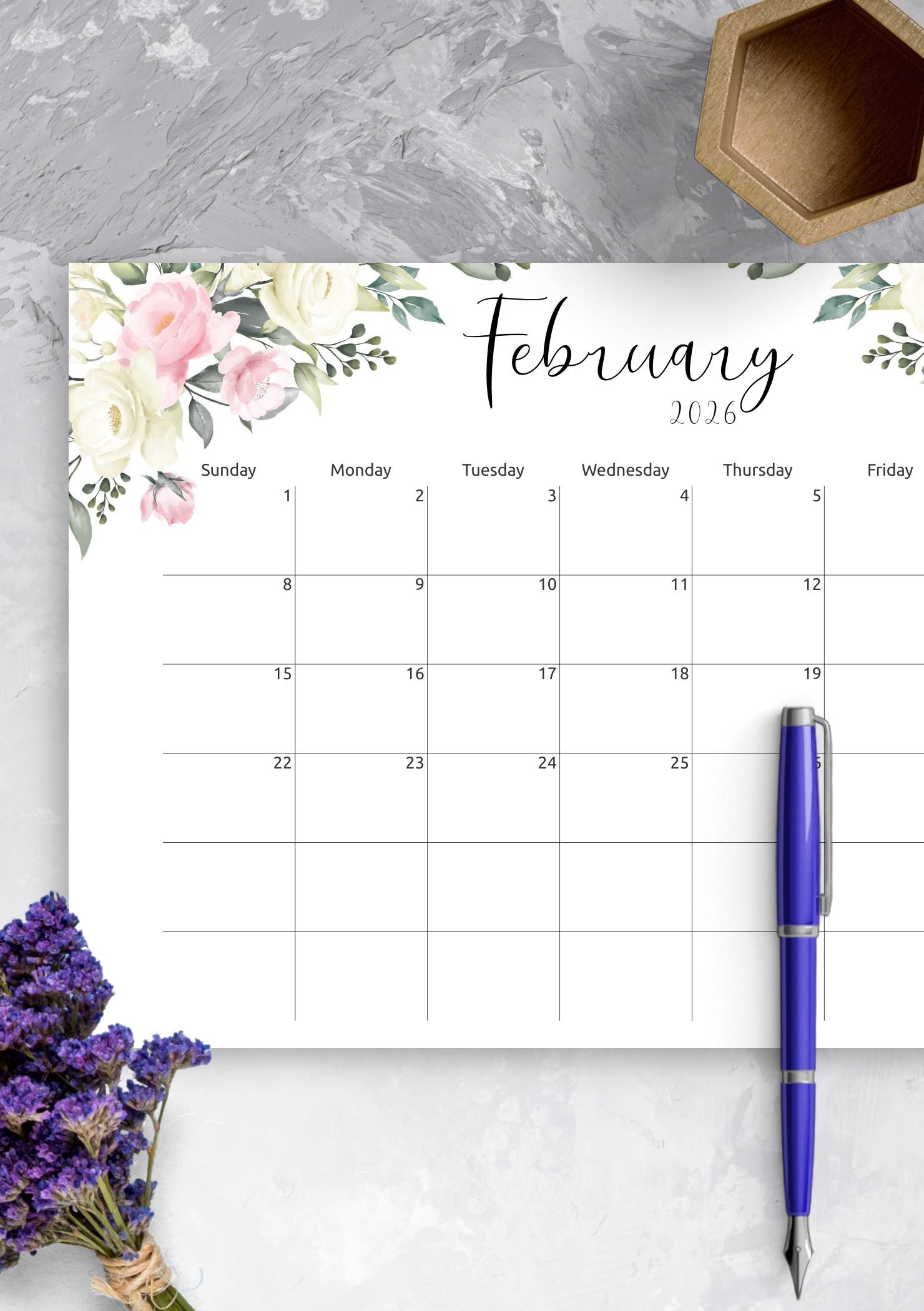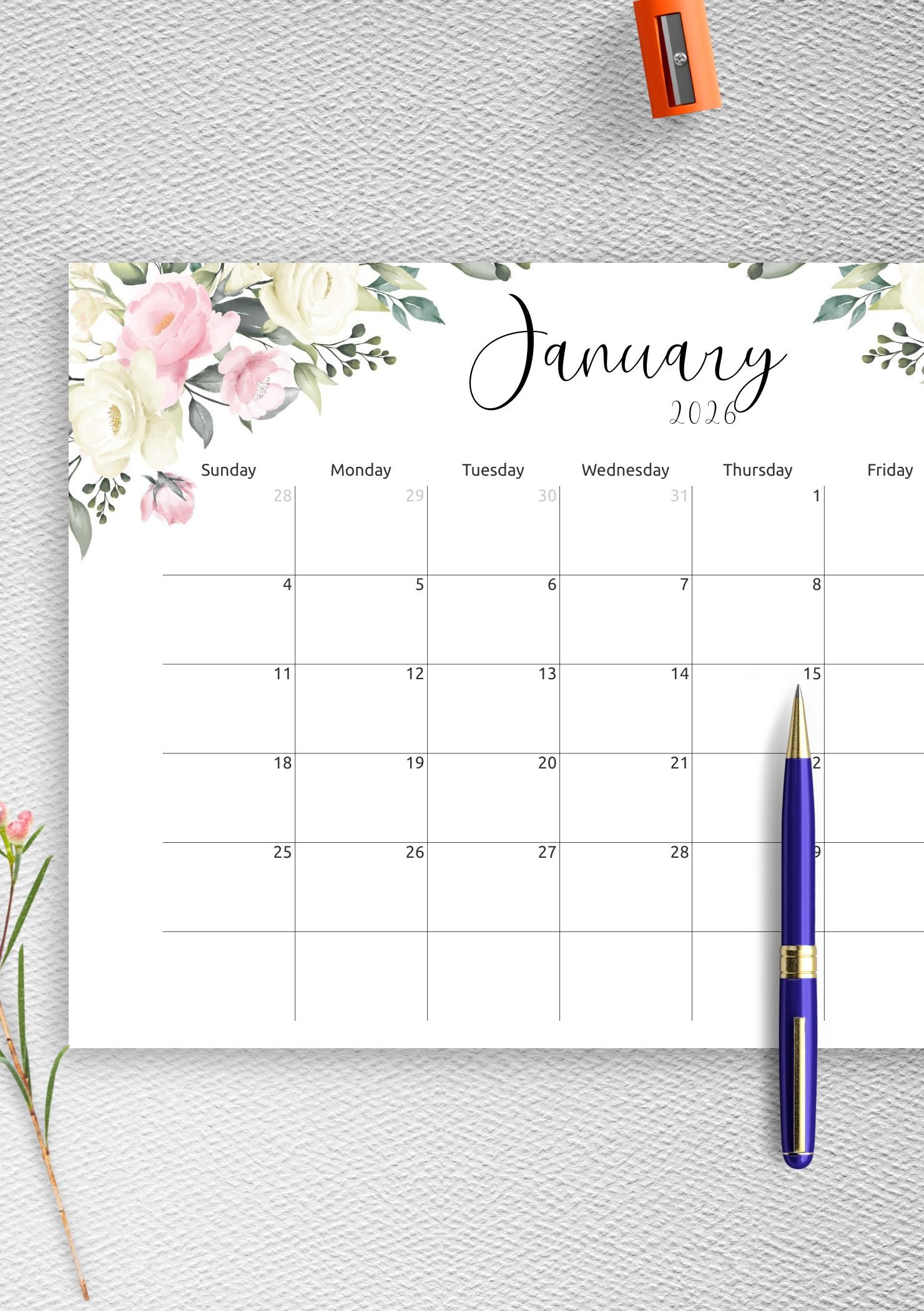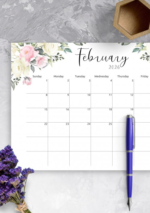 Wonderful monthly calendar template with the floral design and nice calligraphy font for enjoyable planning and simple time management. Download PDF now to start using it as soon as possible.