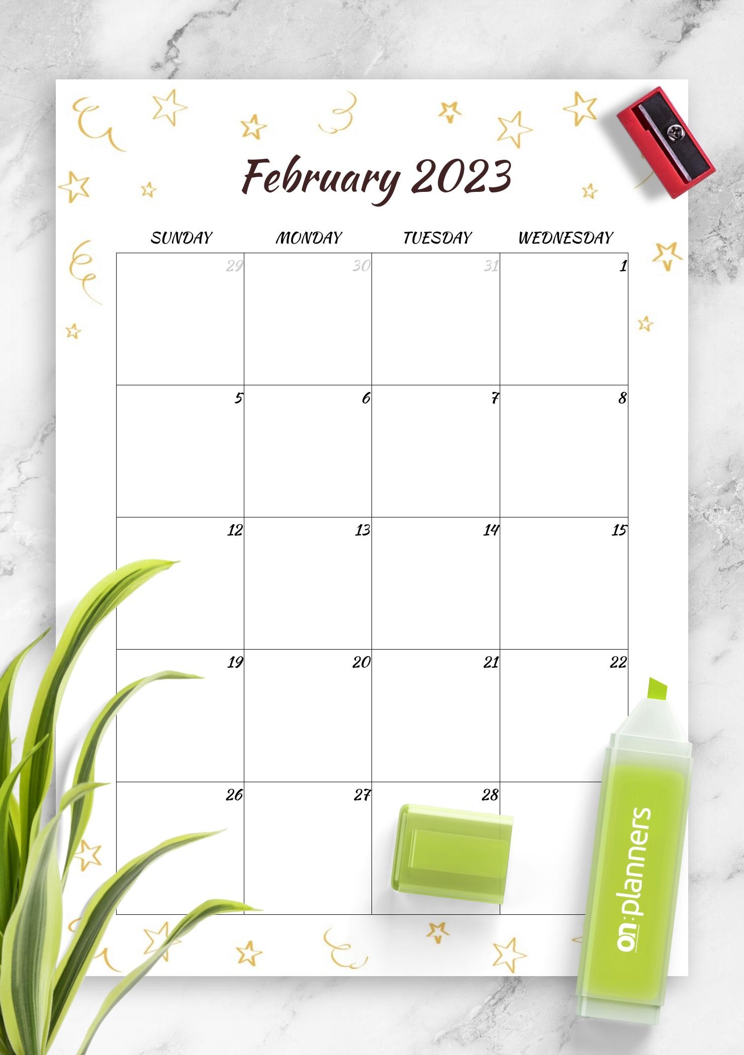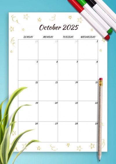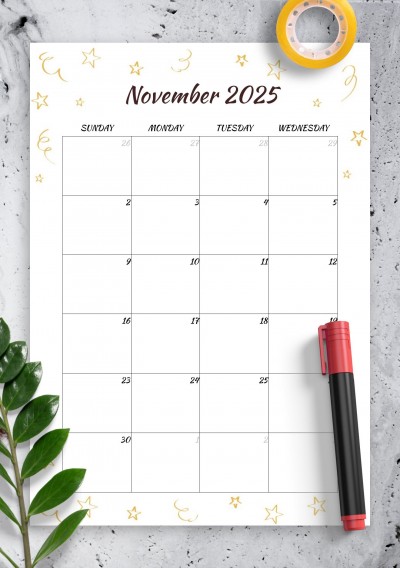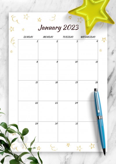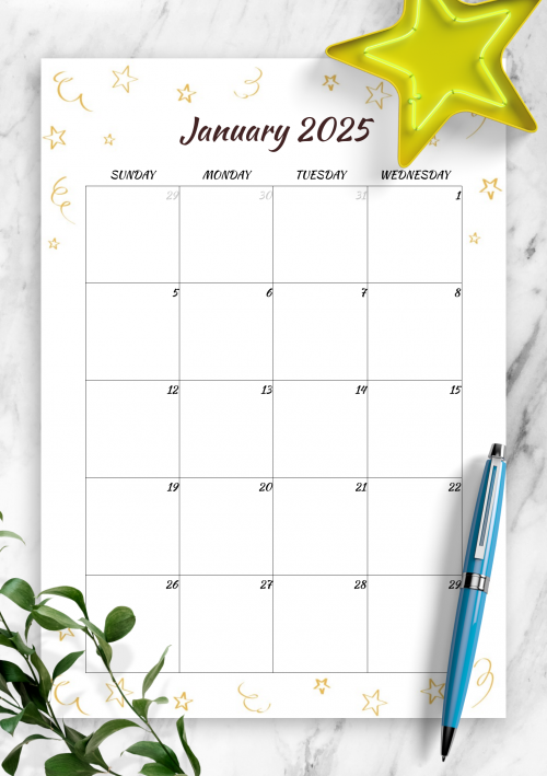 Minimalist birthday calendar template decorated with the golden stars. The template comes with simple monthly grid and two-page format. Choose the page size and download printable PDF.