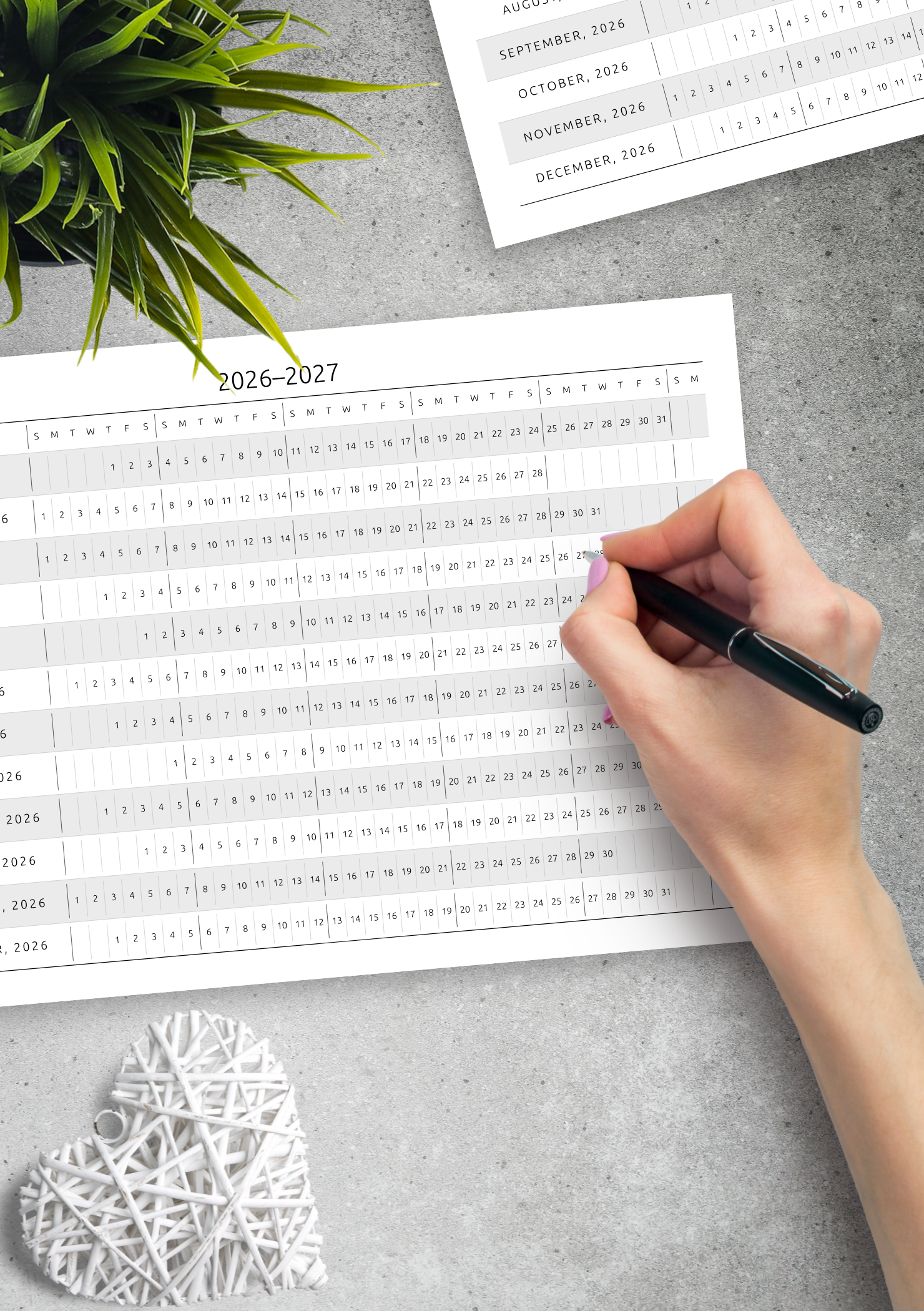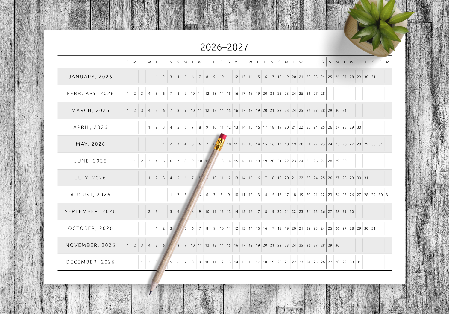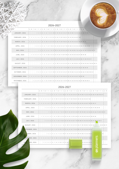 Horizontal Yearly Calendar templates are becoming more and more popular among many people around the world, as they make it possible to view the calendar in a more comfortable format. Create a schedule for the entire year and stick to it so that you don't forget about various events and have time to complete tasks. Download the PDF file and print the layout, enjoy a calendar that displays information horizontally.