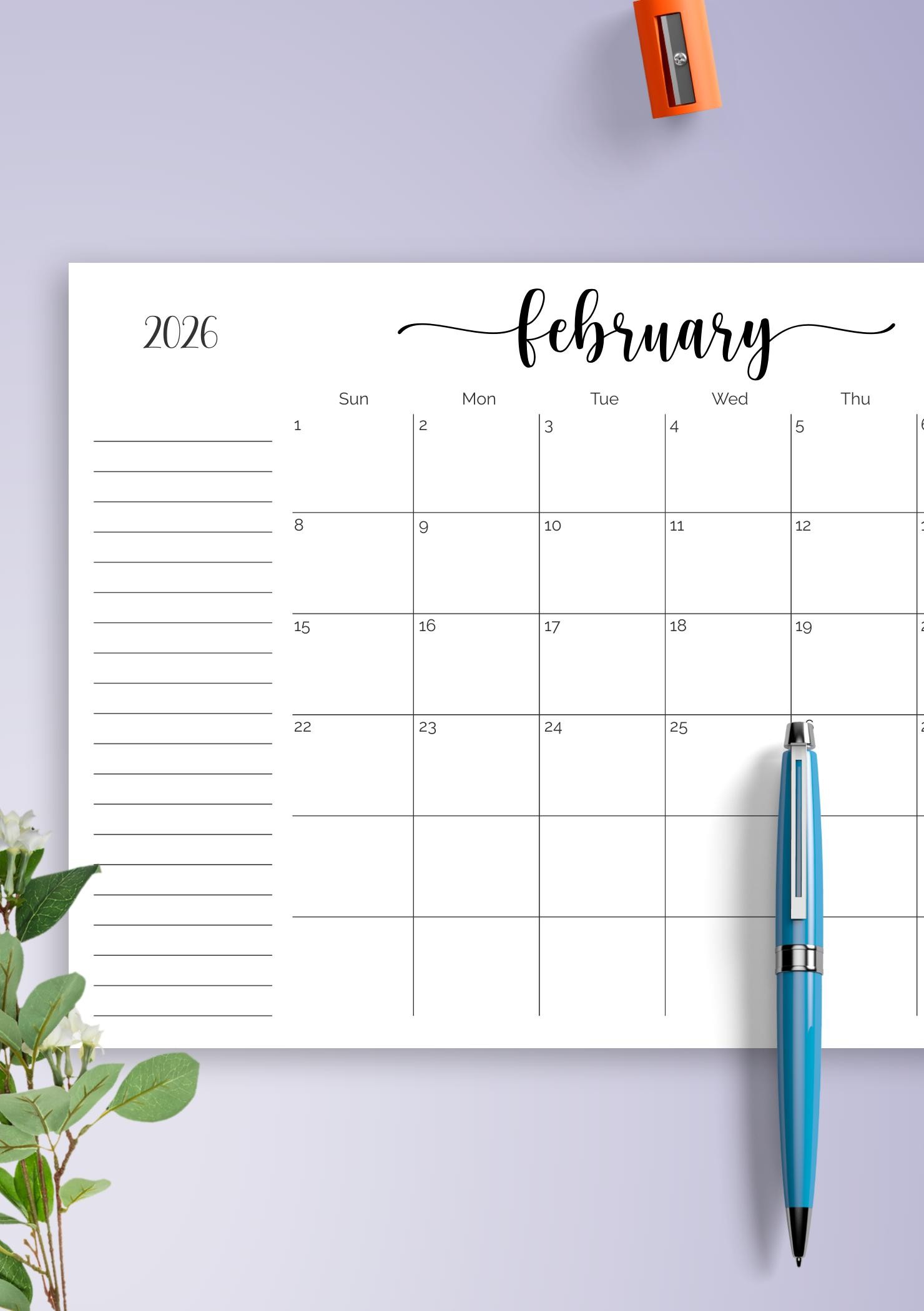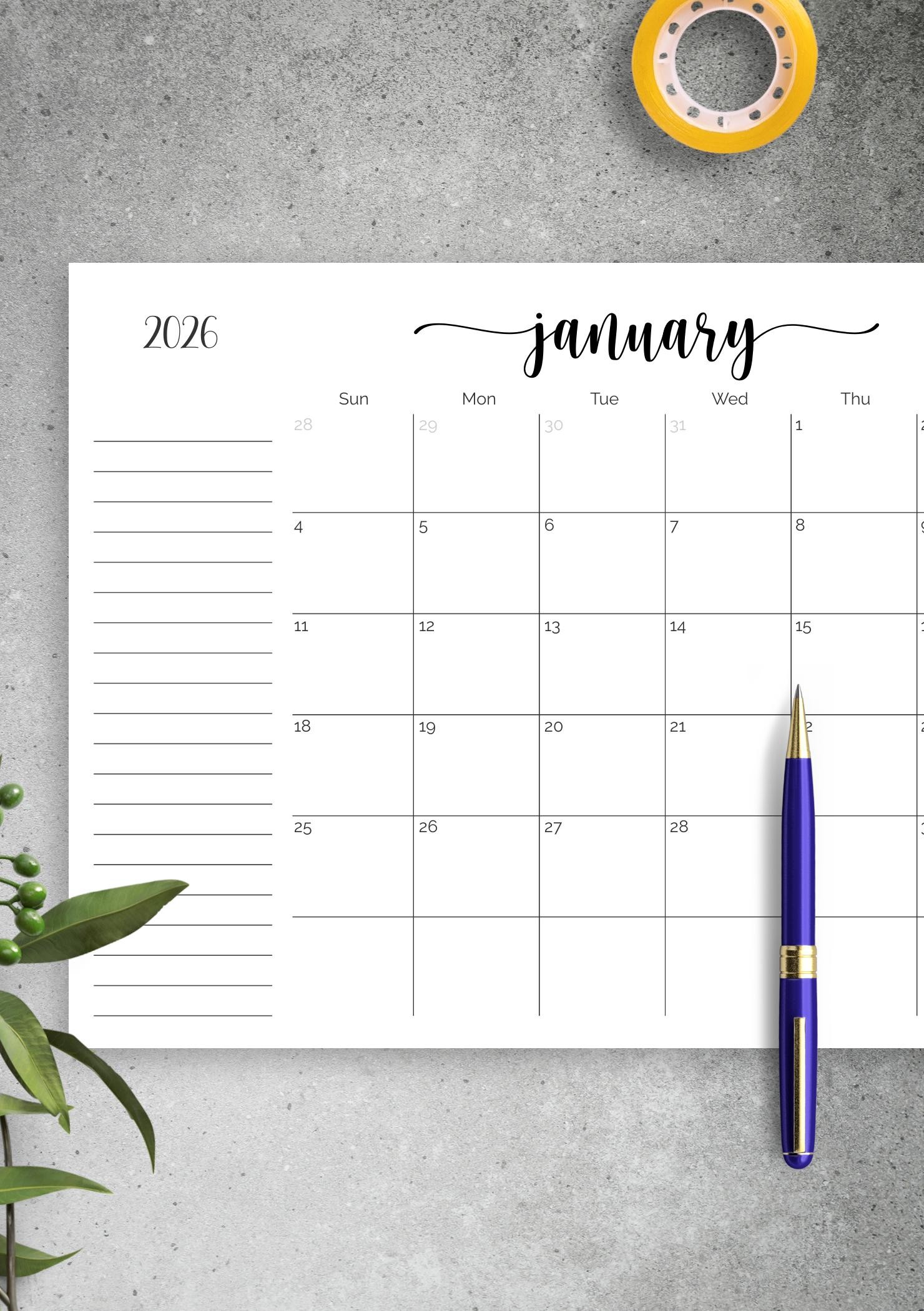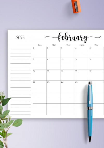 Monthly Calendar with Notes Section