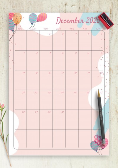 Birthday calendar with the monthly format featuring nice decorations and bright background. Customize the page size and save this template in PDF format to print at home.