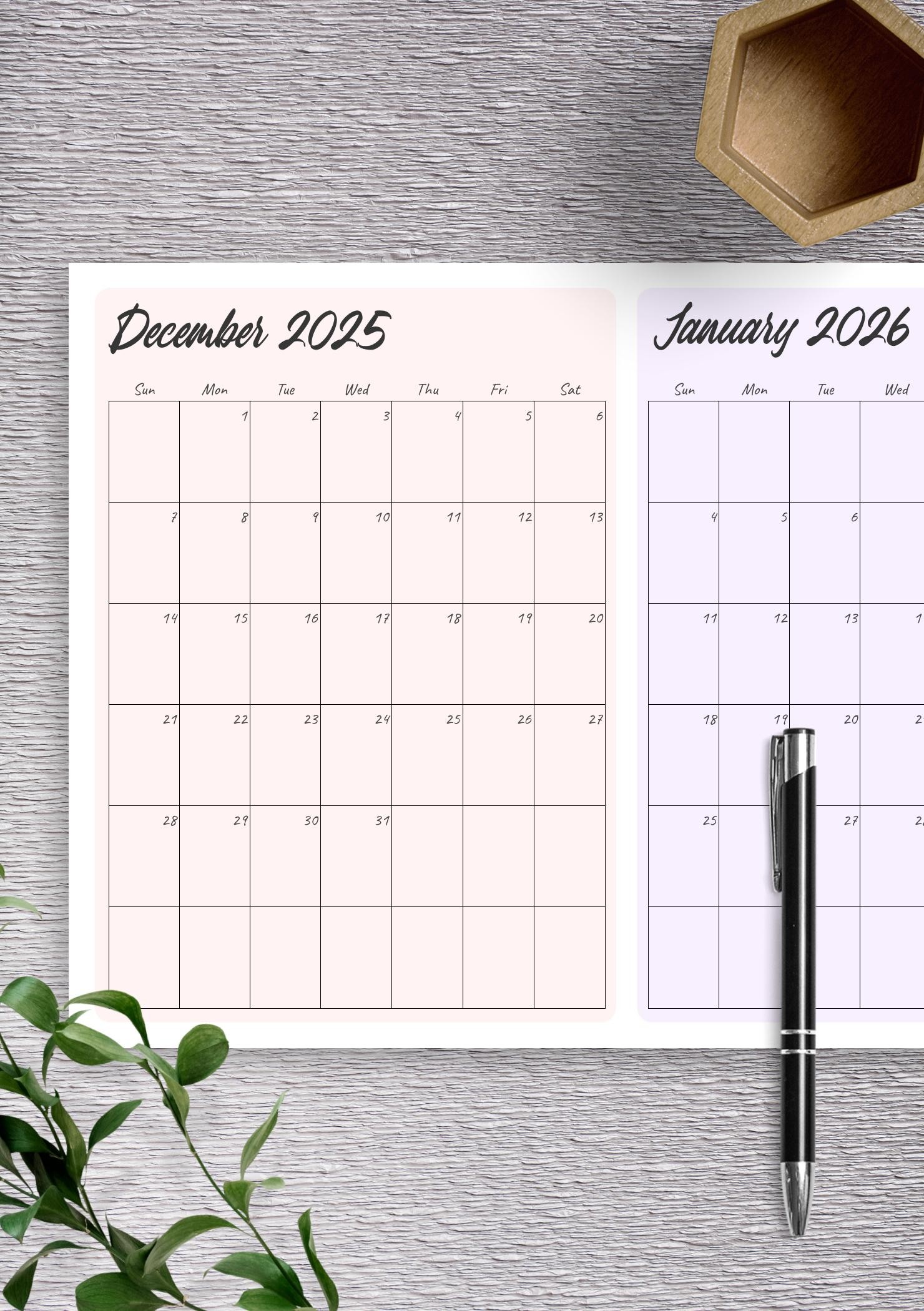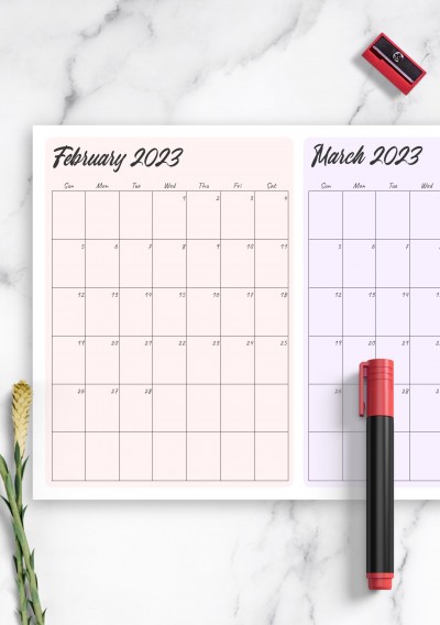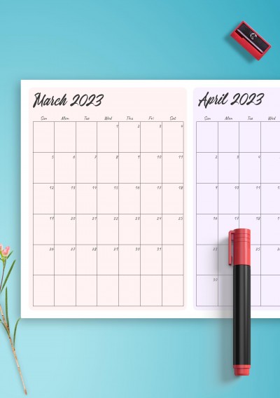 Monthly calendar template with the two pages on one sheet format for comfortable usage and ability to see your plans for two months at a glance. Download printable and iPad-friednly template now to start using asap.