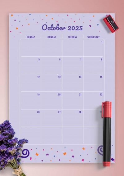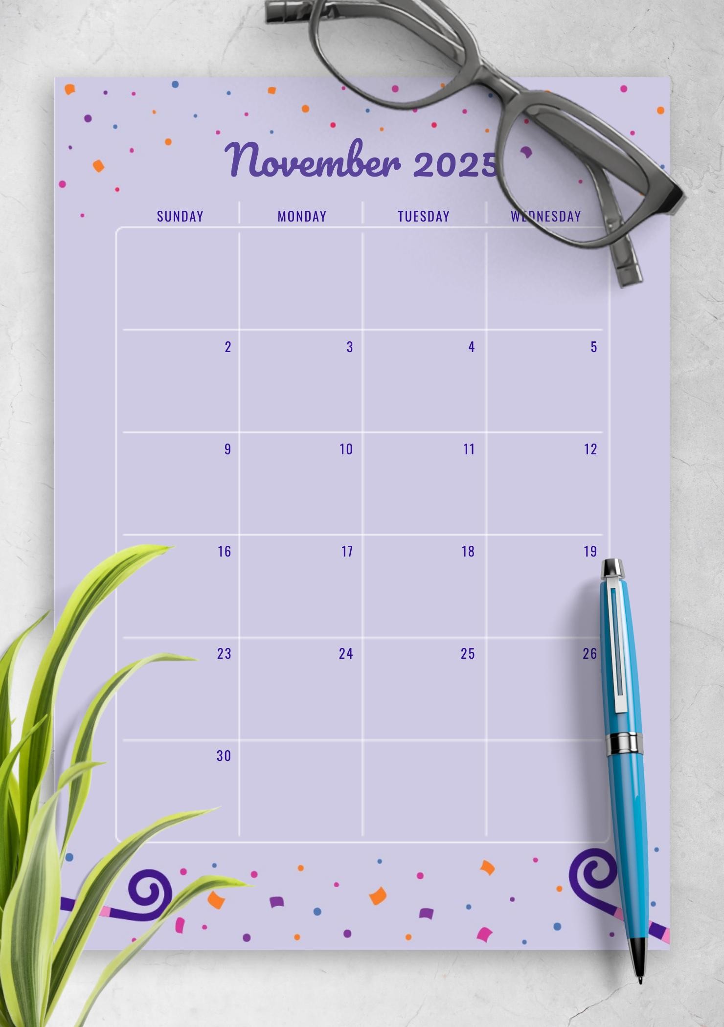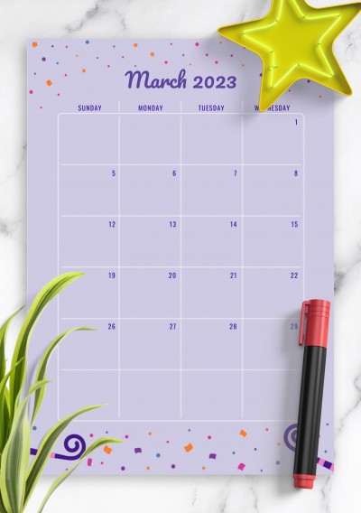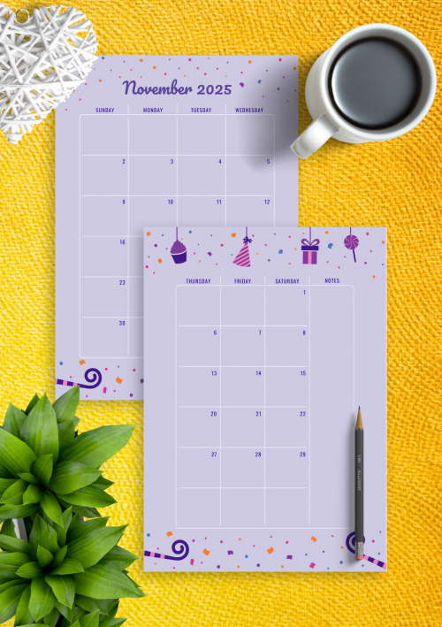 Two-page calendar with a purple background. Choose start day of the week, date range and size to download printable monthly birthday calendar and keep track of all the celebrations easily.