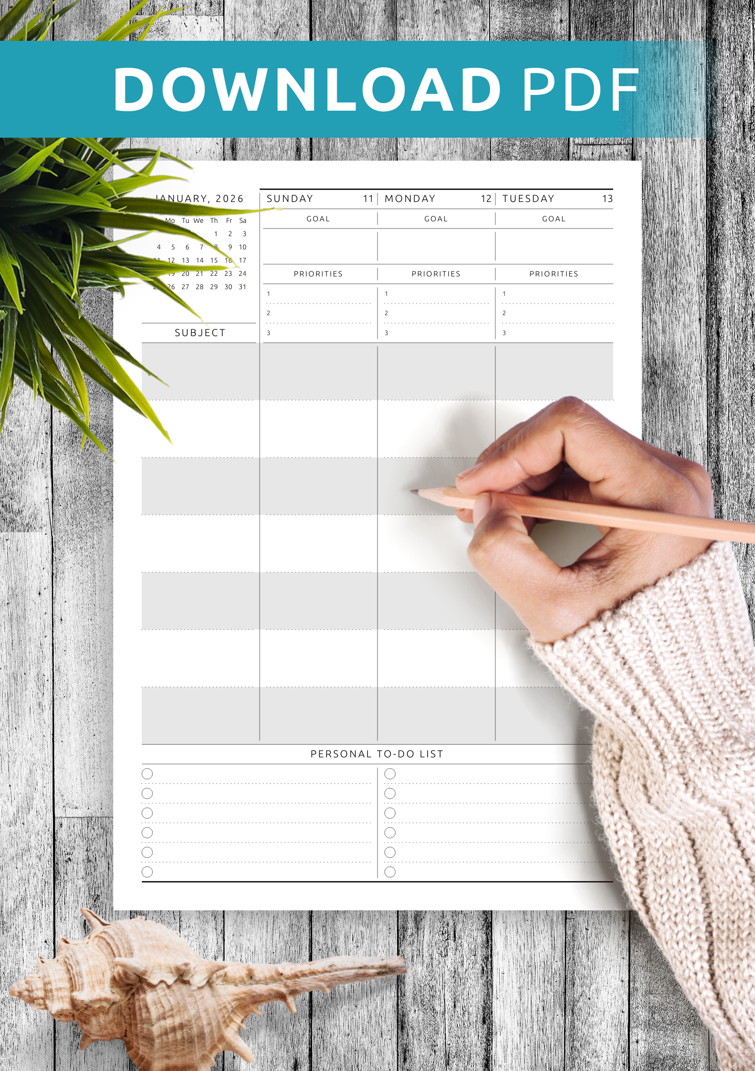 - 7 sections with goals and priorities for every day of the week;