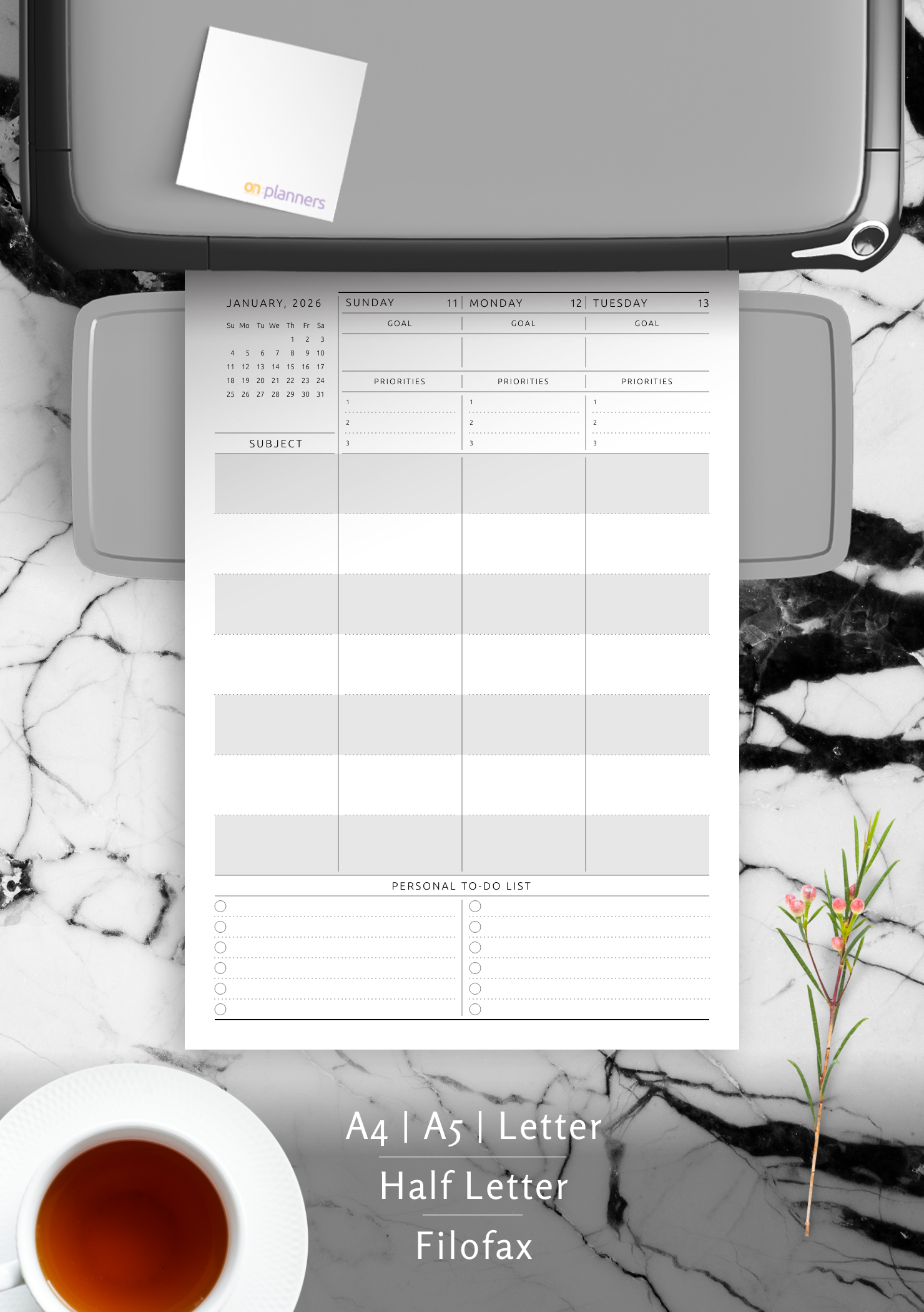 A blank page at the beginning of the document will facilitate the double-sided printing making sure your planner spreads are placed correctly.